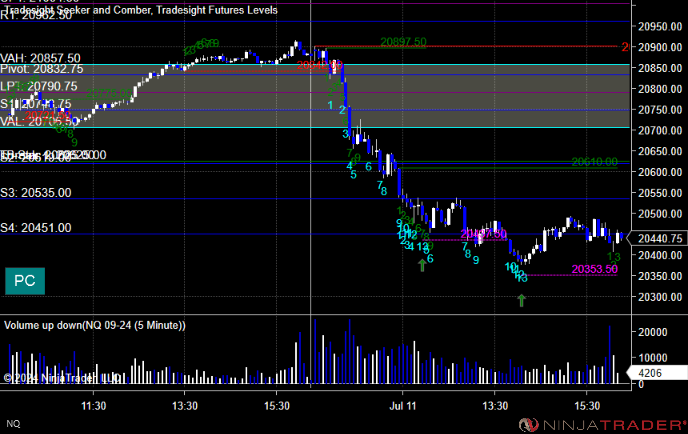The markets gapped down a couple of points, went lower, then ran up, and the ES got a 13 sell signal, hit the risk line exactly, and dropped to lows of the day on 5.9 billion NASDAQ shares.