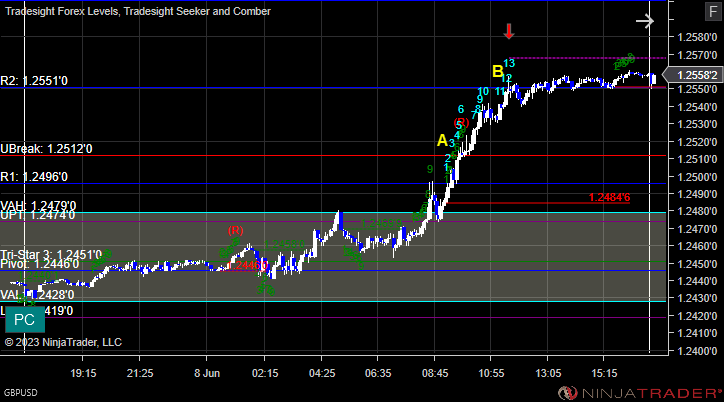 GBPUSD, triggered long at A, hit its first target at B, now holding the second half with a stop one pip under uBreak (1.2512):
