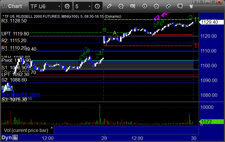 Another gap and go session as the ES came back to the magic 2062.50 level yet again (for the close essentially!). Volume started out strong but drifted off as we are now in "end of month/quarter/half year mode" as we have been expecting all week. We got to 1.9 billion NASDAQ shares.