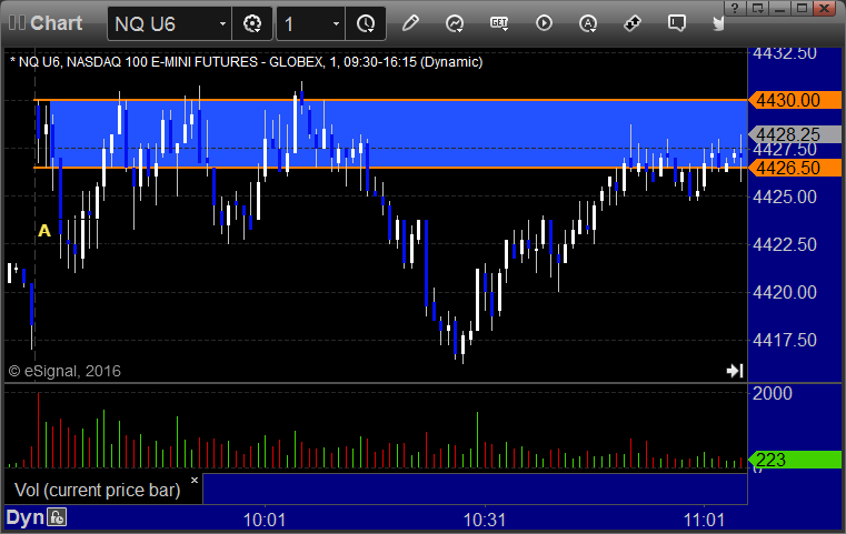 NQ Opening Range Play triggered short at A and stopped, which was a bummer because if the trigger hadn't been so far below the ORL, it moved enough to get a partial: