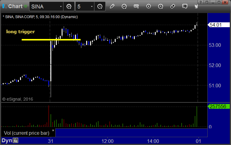 From the report, SINA triggered long (without market support due to opening 5 minutes) and worked: