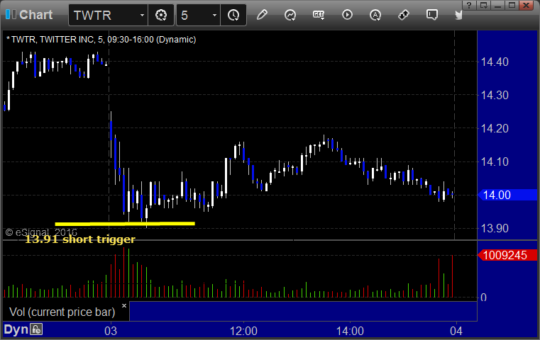 TWTR triggered long (with market support) and ended up working great (off of a Seeker buy signal on both the daily and 30 minute, which SHOULD have worked) but I gave up on it after 45 minutes of nothing happening and the market rolling: