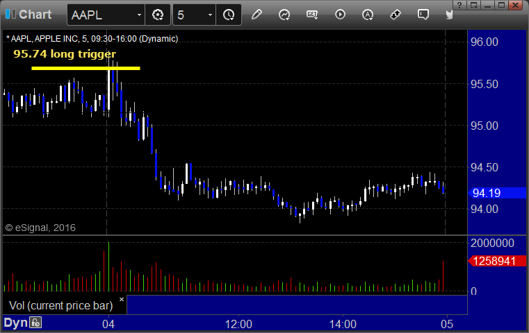 From the Messenger/Tradesight_st Twitter Feed, Rich's AAPL triggered long (without market support due to opening 5 minutes) and didn't work: