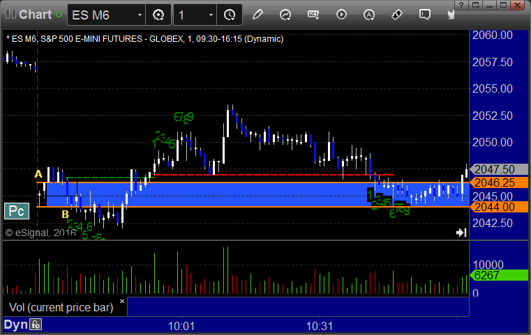 ES Opening Range Play triggered long at A and didn't work, triggered short at B and did: