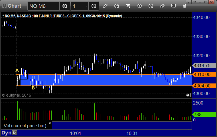 NQ Opening Range Play triggered long at A and didn't work, triggered short at B and stopped: