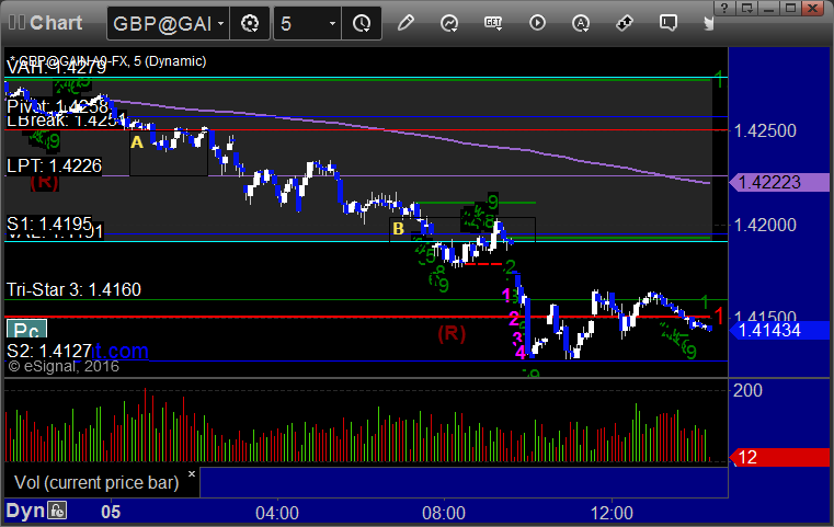 The second half of the prior day's long stopped out under the new Pivot. The new call triggered short at A, hit first target at B, and we are still holding the second half with a stop over 1.4160: