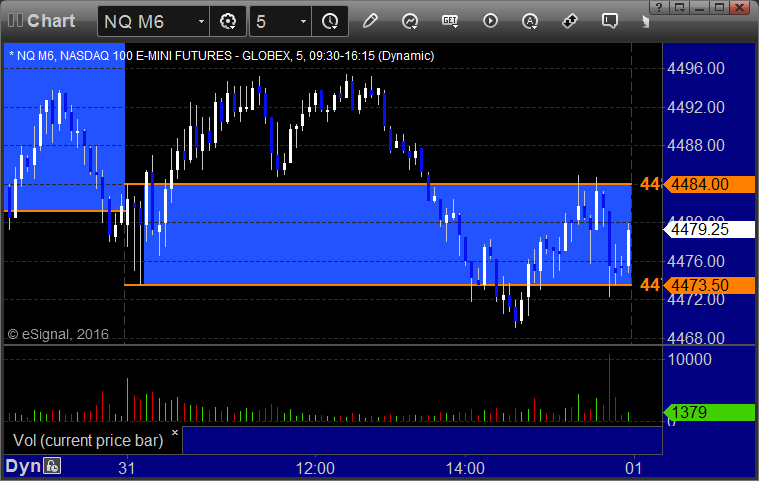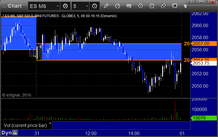 We had one loser and two winners on the Opening Range plays. The markets gapped down and stuck in a narrow range of about 1/3 of average all day. We had a nice setup called in the NQ that never triggered. NASDAQ volume was 1.5 billion shares. See the Opening Range section below.