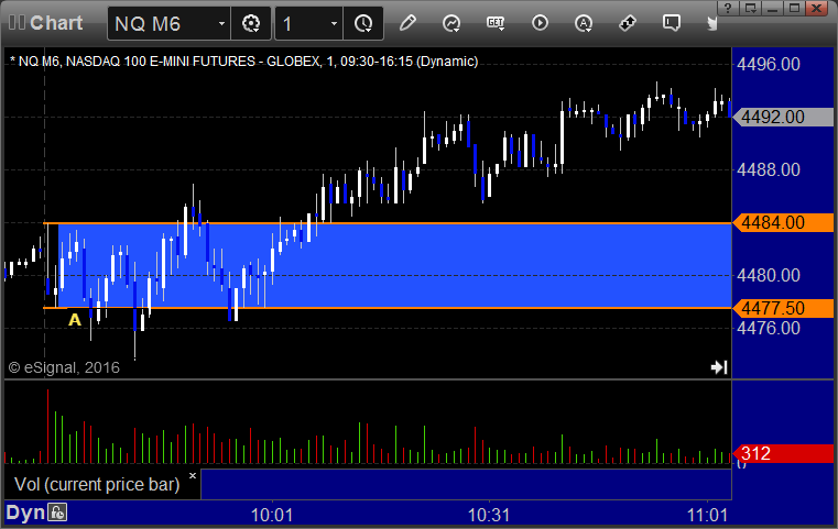 NQ Opening Range Play triggered short at A and worked, long trigger wasn't until over 30 minutes in and volume was light: