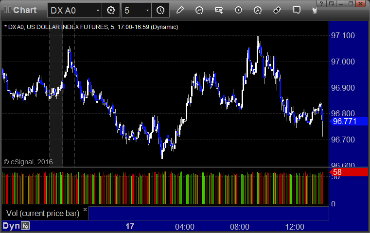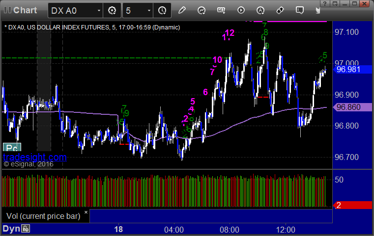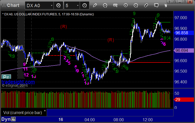 Here's a look at the US Dollar Index intraday with our market directional lines, 13 sell signal was the high: