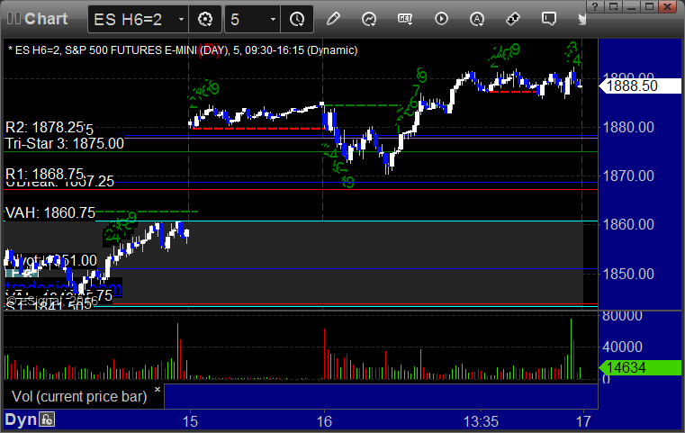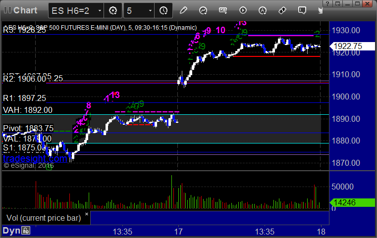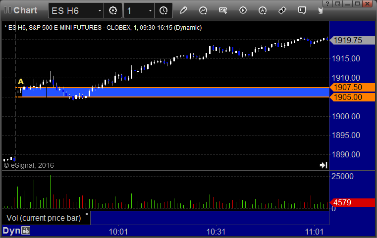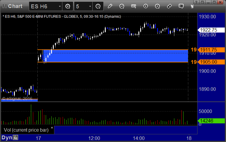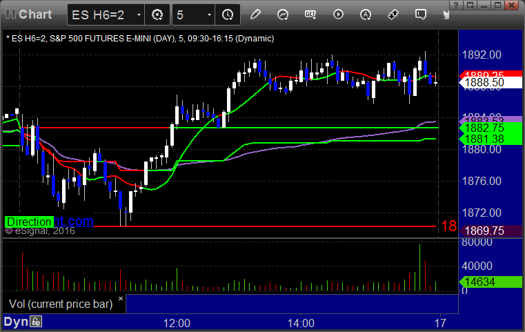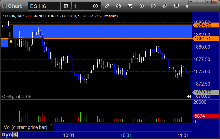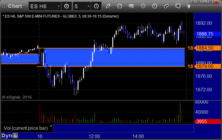 The markets gapped up big to start the week, never filled, and didn't trade close to average range on 1.9 billion NASDAQ shares. The afternoon was a complete waste of time. Opening Range plays worked, and with the gap, the ES never really touched a key level in a way that gave us a setup. We did stick to 1875 for a bit.