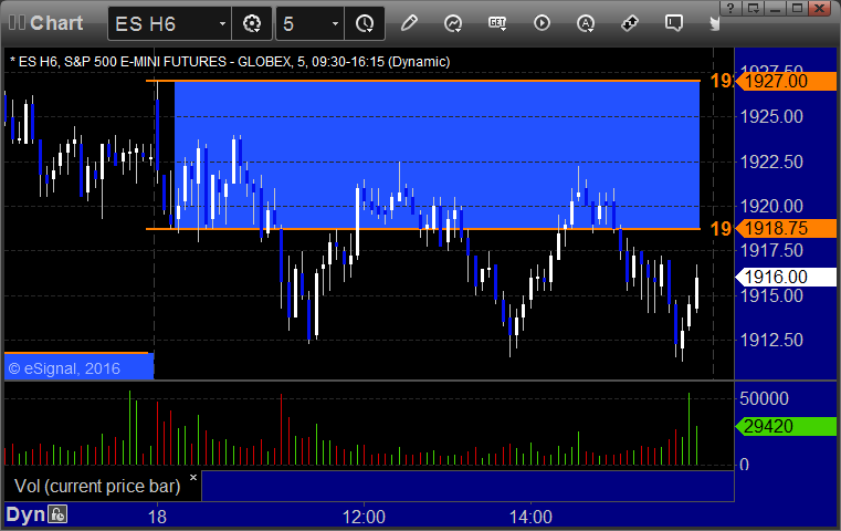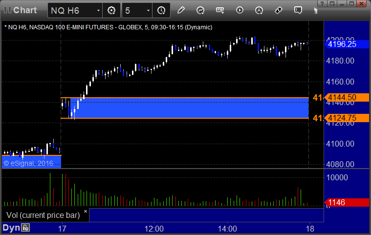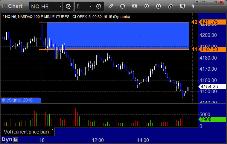 The markets gapped up a little and filled quickly, giving us nice Opening Range plays (in sync with the Value Areas). The rest of the day was fairly unexciting, trading about half of a normal range and the NQ staying mostly inside the Value Area on a weak 1.6 billion NASDAQ shares (with an early volume warning). There might have been a slight boost in that volume number due to a minor options unravel, but it didn't add up to much. No other calls again based on the setups. Slow week, but nice OR plays, see that section below.