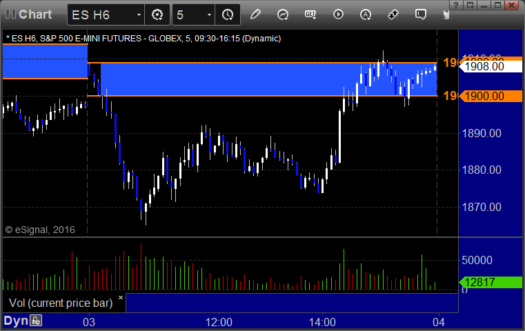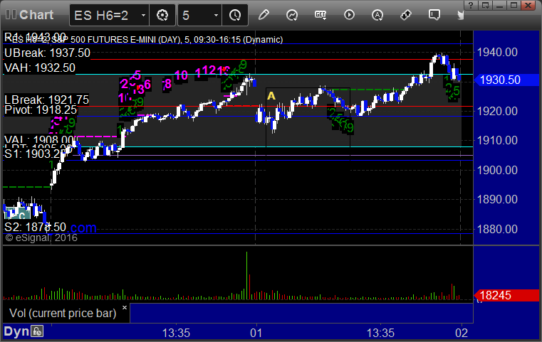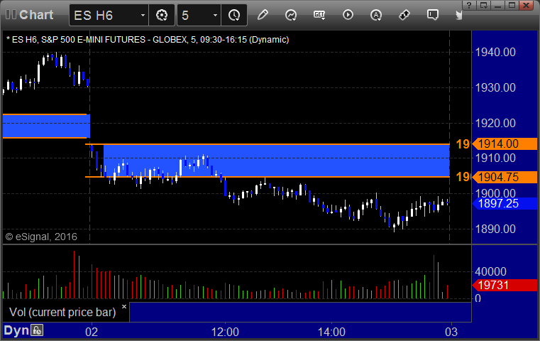 A very dead session to start the month of February. Mondays don't have to be exciting but this was a little ridiculous. The S&P 500 literally closed down less than a point and spent the first several hours in a tiny range after gapping down. With that, of course, the futures were choppy, so we're off to a slow start for the month. See the ES section for Mark's call and the Opening Range plays.