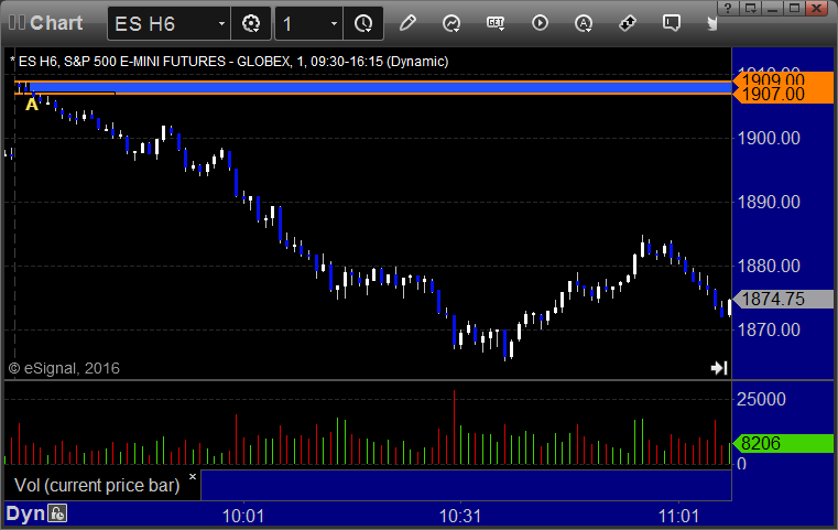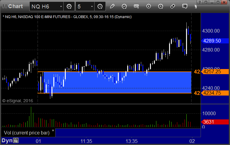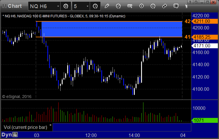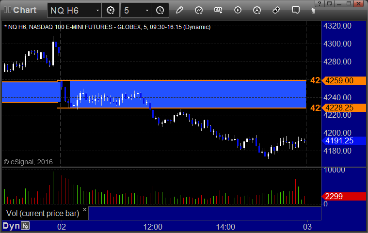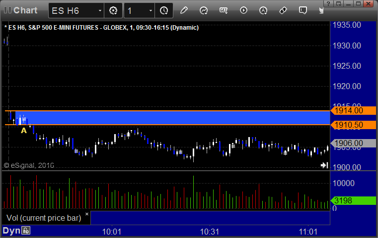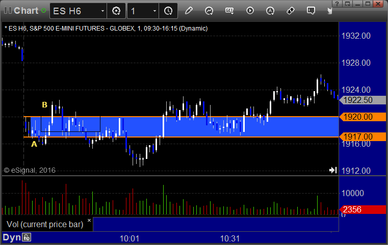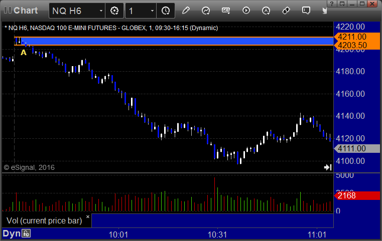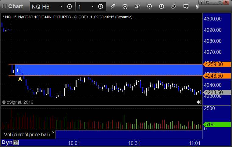 NQ Opening Range Play triggered short at A and worked enough for a partial. The long entry trigger was too far outside of the range to take under our rules: