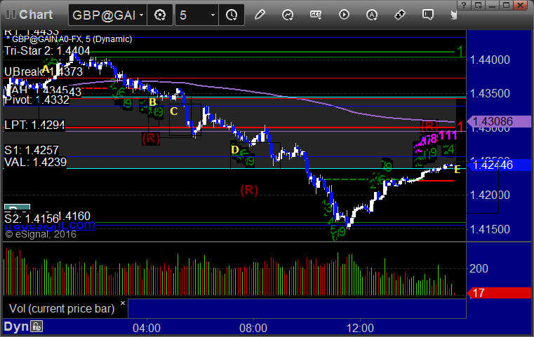 We came in long the second half of the prior day's trade with a stop under LBreak. The new long idea triggered at A (when this happens, you should raise stop on the piece from the prior session if you are awake) and stopped out. If you didn't adjust then the second half of the prior trade stopped at B. The new short triggered at C, hit first target at D, actually went all the way to S2, and closed for end of week at E: