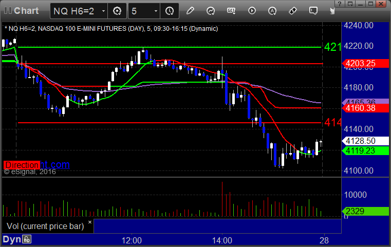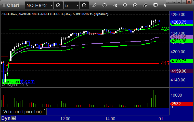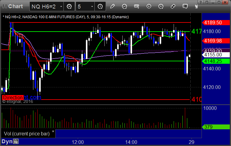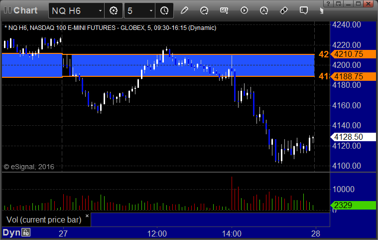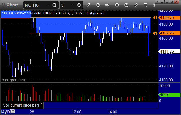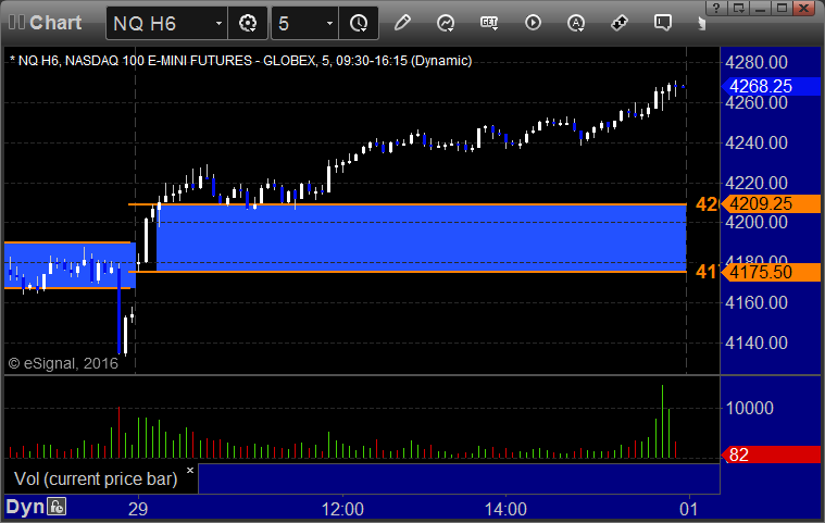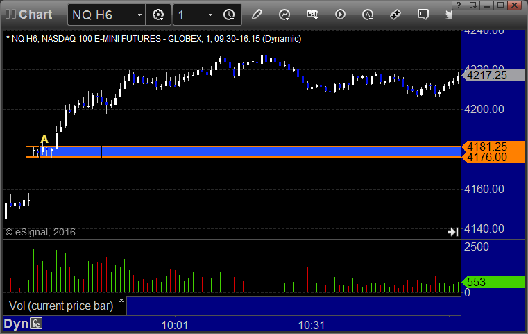 The markets gapped up and filled in about an hour and then did not much else for the rest of the day, closing on the VWAP (before dropping right after the stock market close) on 2.1 billion NASDAQ shares. Opening range plays worked, see that section below. I tried to post an ES call but it went too quick.
