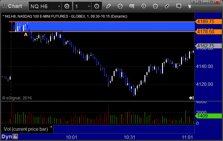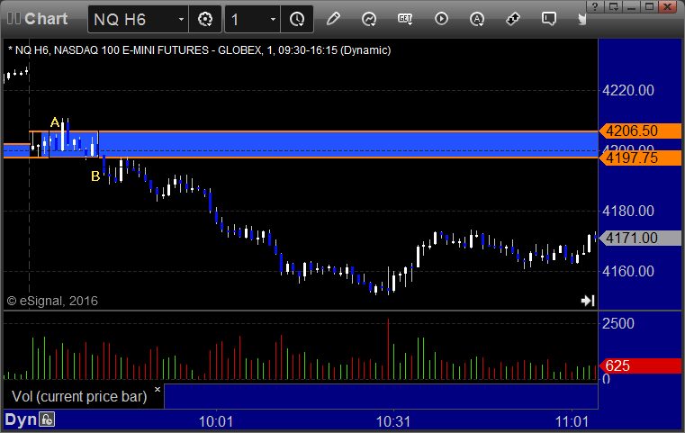 NQ Opening Range Play triggered long at A and stopped, triggered short at B and worked: