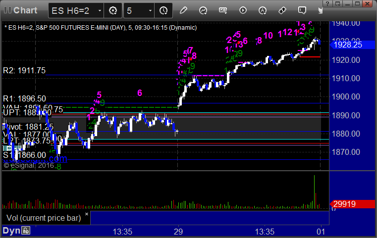 The markets gapped up and kept going, closing the month and week on an unusual (for month end) gap and go session on 2.3 billion NASDAQ shares. Opening Range plays worked great, and you could have taken the ES long over R2 as well for a clean play.