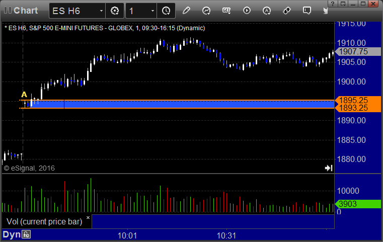ES Opening Range Play triggered short at A and stopped, triggered long at B and stopped: