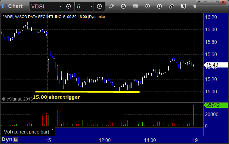 VDSI, CERN, and GOGO gapped below their short triggers, no plays.