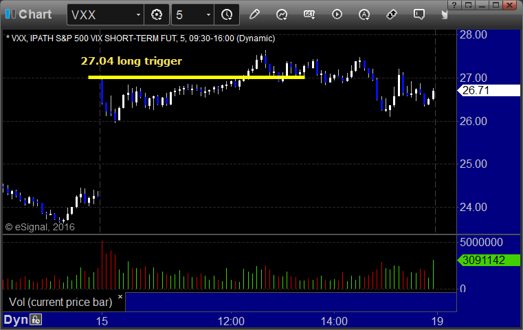 His VXX triggered long (ETF, so no market support needed) and worked enough for a partial: