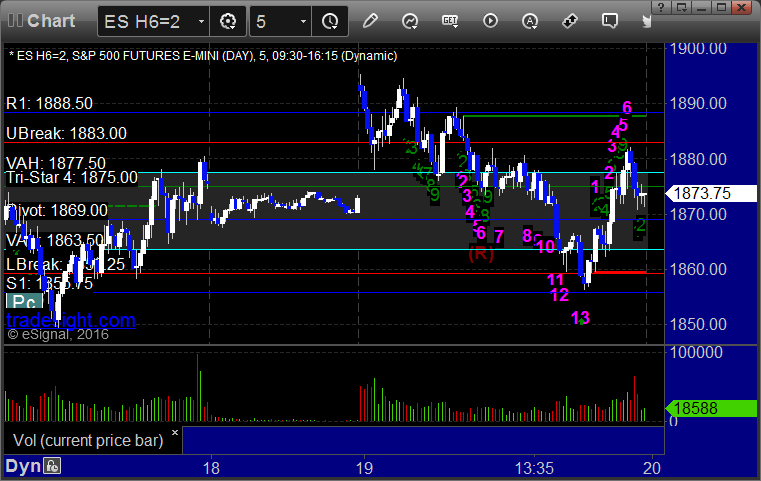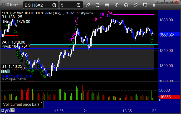 The markets opened much flatter and were choppier than the last few days. We pushed lower early, then reversed to highs, topped out on a ES Comber 13 on the 5 minute chart, and then got stuck in neutral on the VWAP for the last three hours on 2.2 billion NASDAQ shares. Opening range plays worked, see that section below, and the main trade call didn't trigger.