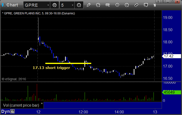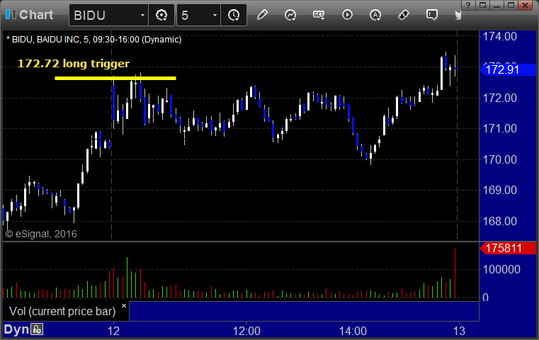 With each stock's recap, we will include a (with market support) or (without market support) tag, designating whether the trade triggered with or without market directional support at the time. Anything in the first five minutes will be considered WITHOUT market support because market direction cannot be determined that early. ETF calls do not require market support, and are thus either winners or losers.