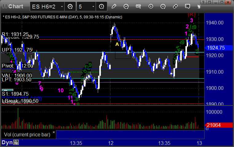 Triggered short at A at 1928.00, hit first target for 6 ticks, and stopped second half over the entry: