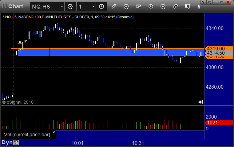 NQ Opening Range Play triggered long at A and stopped, triggered short at B and worked: