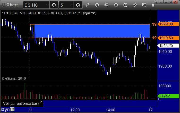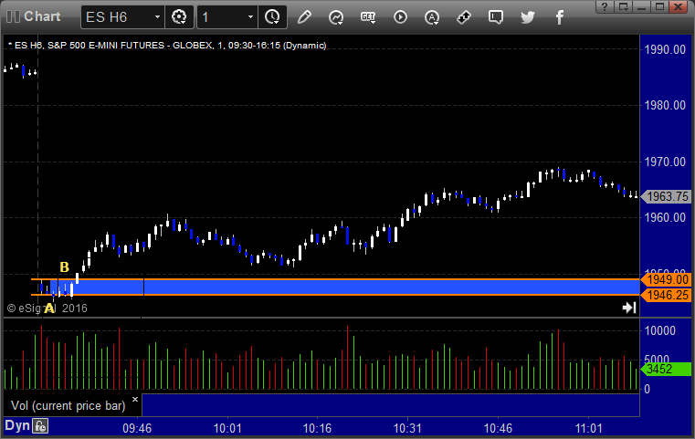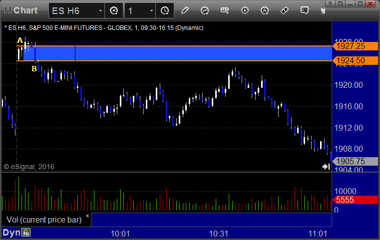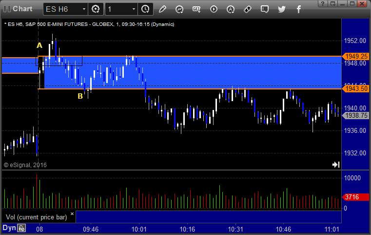 ES Opening Range Play triggered long at A and stopped, triggered short at B and worked: