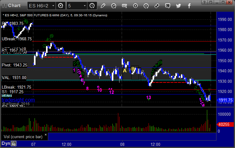 My call triggered short at A at 1943.00 and stopped. I put it back in, triggered short at B, hit first target for 6 ticks and stopped second half over entry: