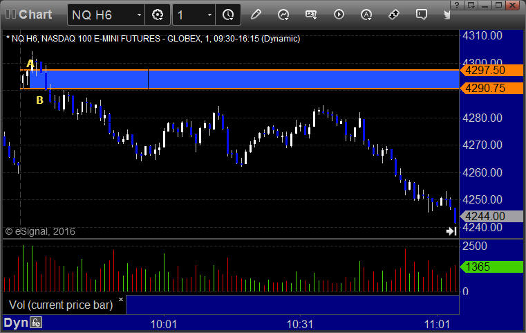 NQ Opening Range Play triggered long at A and stopped, triggered short at B and worked: