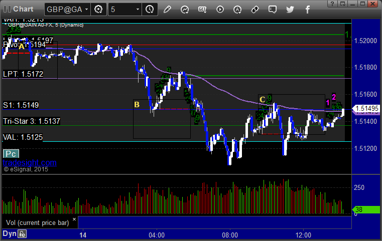 Triggered long at A, hit first target at B, second half stopped. Triggered short at C and closed 25 pips in the money at D for end of session: