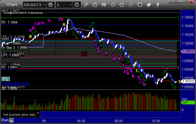 Triggered short at A, hit first target at B, lowered stop in the morning and stopped over S1 at C: