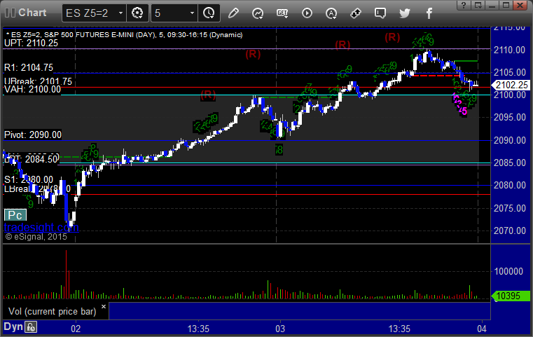 As usual, let's start by taking a look at the ES and NQ with our market directional lines, VWAP, and Comber on the 5-minute chart from today's session: