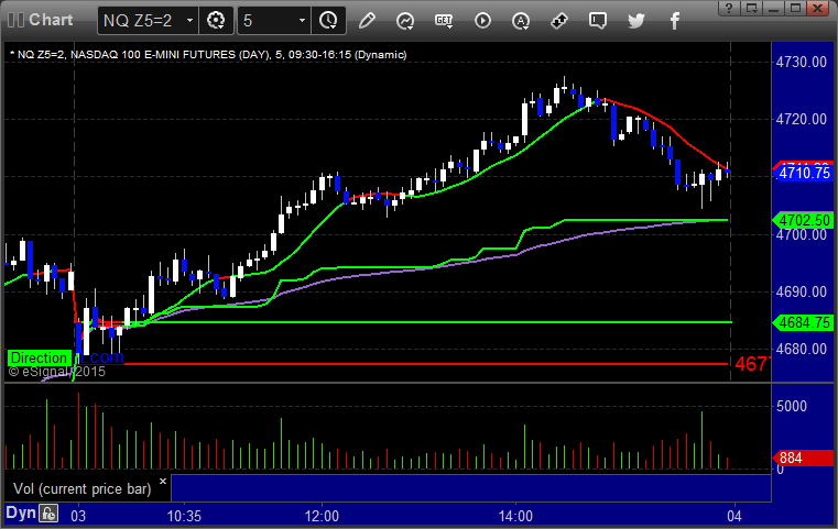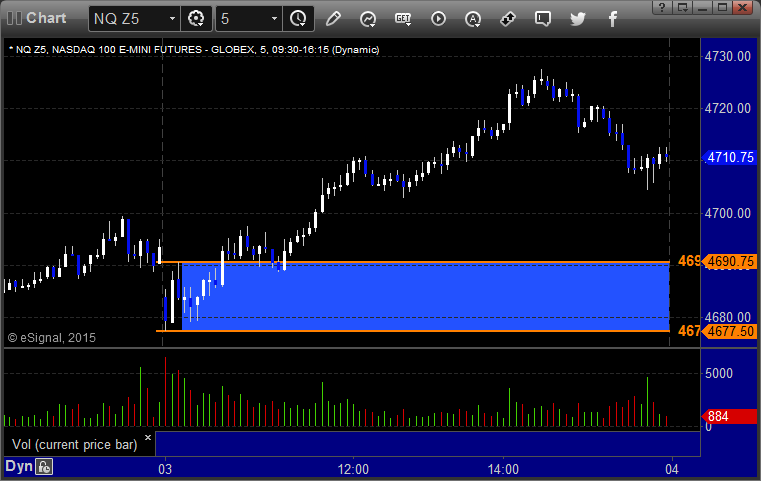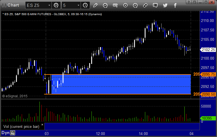 We knew it would be a dead session, and it was. Markets were flat all day until the last 30 minutes or so. No setups would have worked and we had mixed results on the Opening Range plays. ES worked and NQ did not, so they offset. See that section below. NASDAQ volume was 1.8 billion shares.
