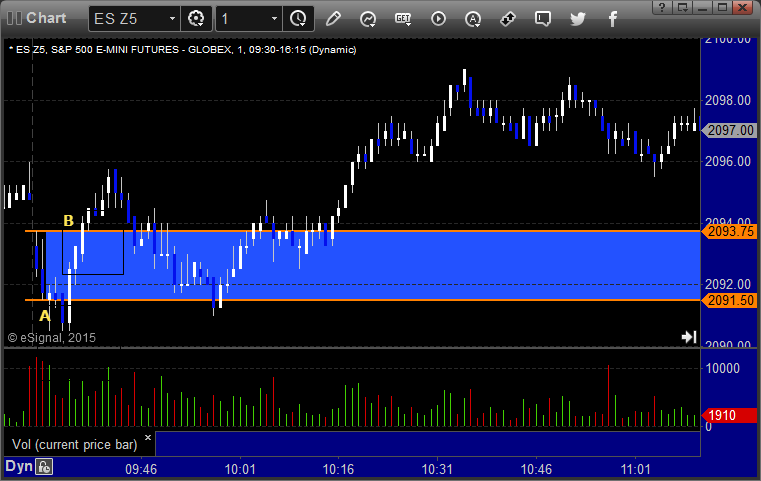 ES Opening Range Play triggered short at A and stopped, triggered long at B and worked enough for a partial: