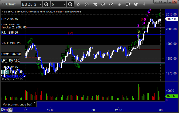My call was a long over R1 at 1996.75 at A after it set beautifully on the spike on the release of the Fed minutes. This was also the 61.8% Fib retracement on the daily chart that we have been monitoring. Hit first target for 6 ticks, raised the stop several times, and stopped 28 ticks in the money: