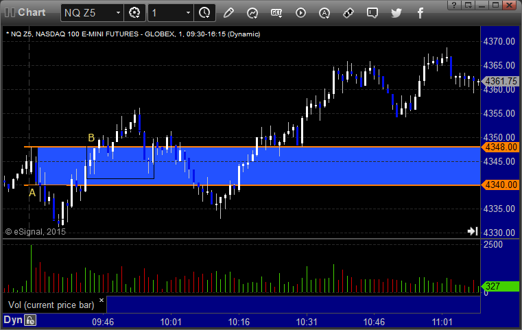 NQ Opening Range Play triggered short at A and worked enough for a partial. Triggered long at B and worked: