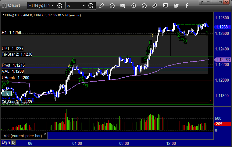 Triggered long at A, hit first target at B, still holding second half with stop under UPT: