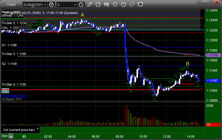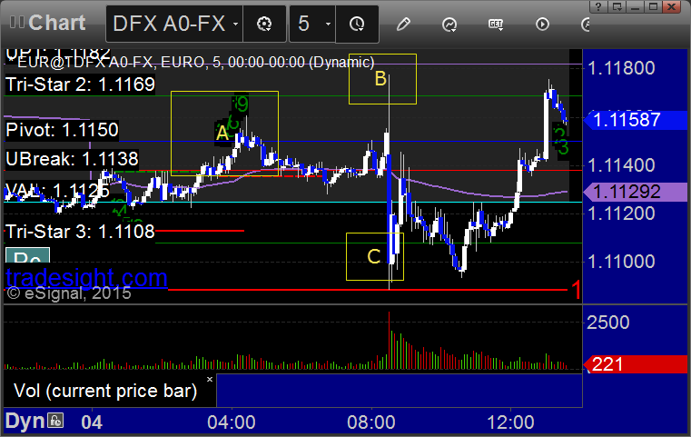Came into the session short the second half of the EURUSD from the prior session. Our stop was over UBreak, which came close but never stopped at A. Kept working lower overnight and we still have it with a stop over S2 at B, about 200 pips in the money:
