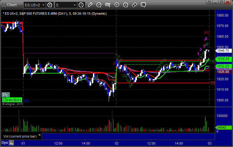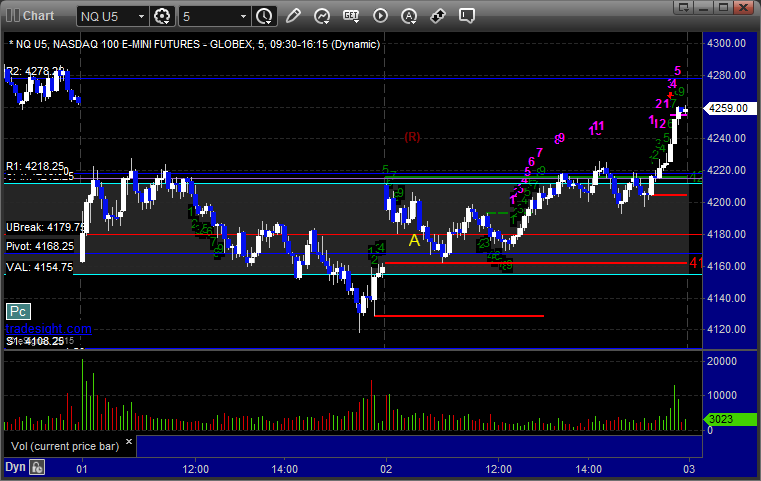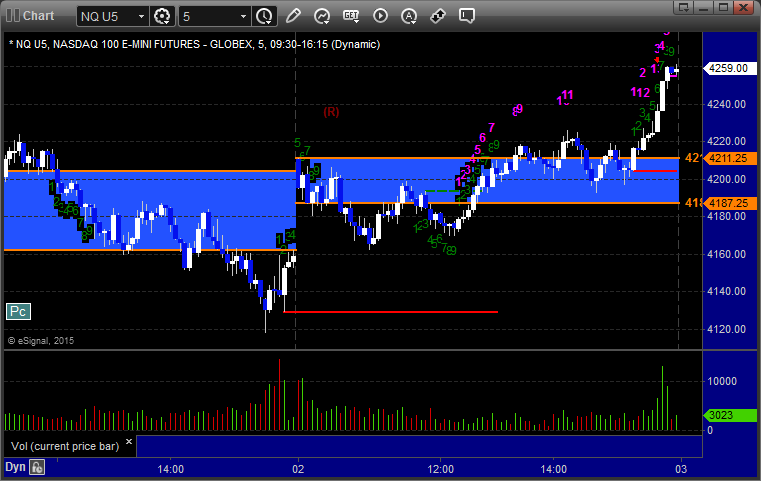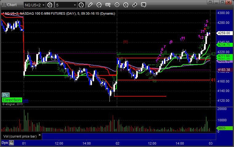 As usual, let's start by taking a look at the ES and NQ with our market directional lines, VWAP, and Comber on the 5-minute chart from today's session: