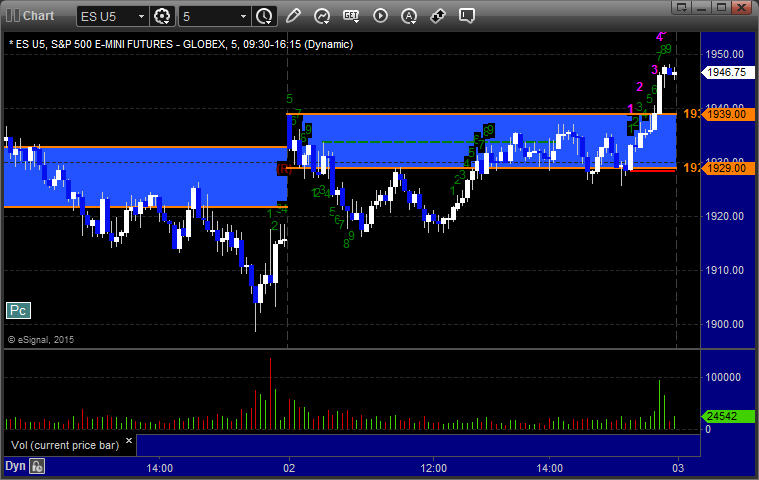 Triggered long at A at 1937.50, stopped initially on a sweep, triggered again, hit first target for 6 ticks, closed second half at 1940.50 for 12 ticks for end of day: