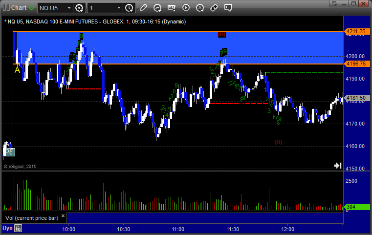 The markets gapped up a little, went higher initially, got a Comber 13 sell signal at the top on the ES, then filled the gap over lunch and closed near lows but barely green on 1.6 billion NASDAQ shares. We had a bad volume number early, so after the Opening Range plays both worked, we made no extra calls. See that section below.