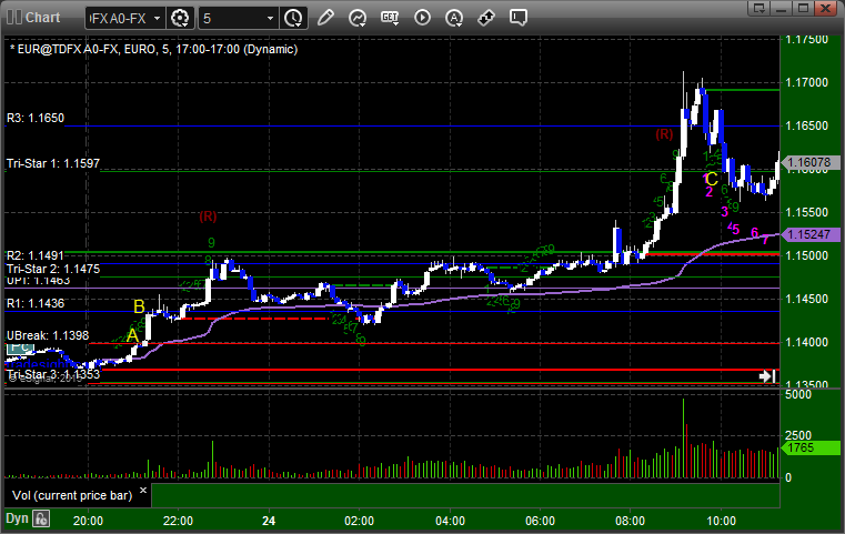 Triggered long at A, hit first target at B, which looks like a blip now, and moved stop in the morning and stopped out at C for 200 pips: