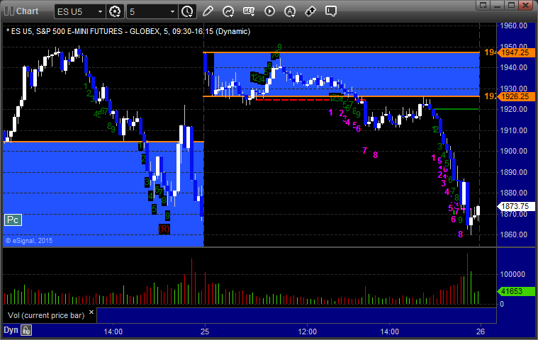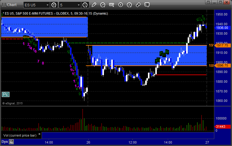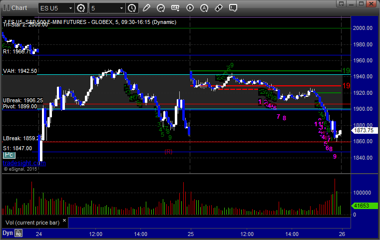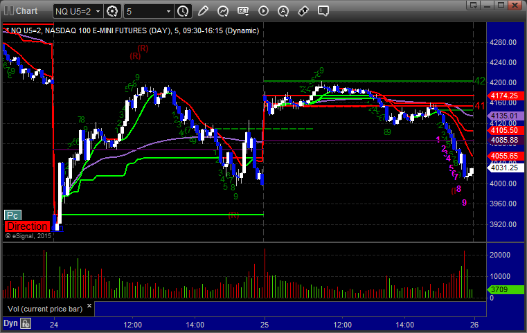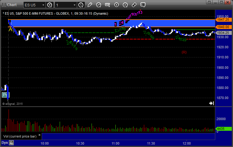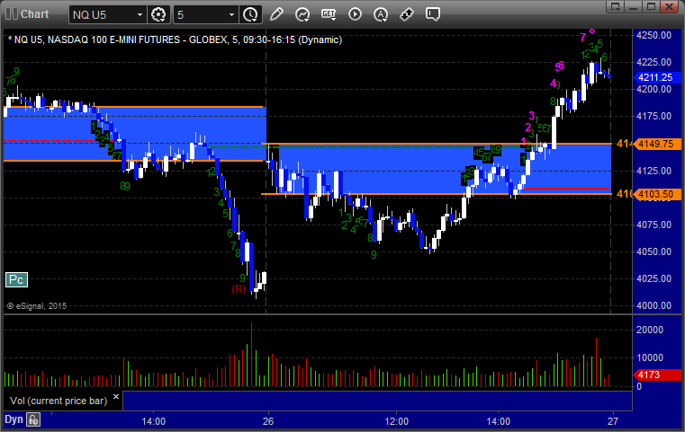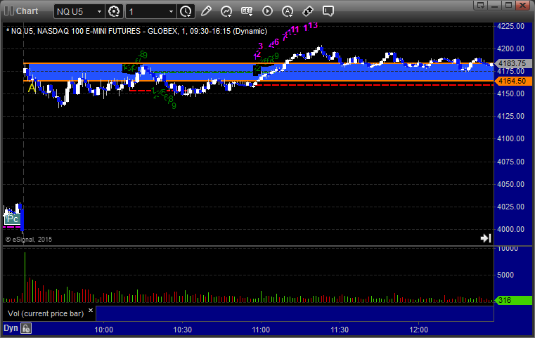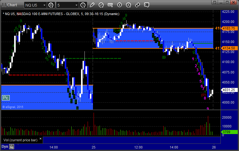 With the gap and expected volatility, I passed on the Opening Range plays (although the ES Institutional Range play would have worked great). The markets recovered about 75% of the drop and then stalled out over lunch and picked up speed to the downside later in the session on 3.2 billion NASDAQ shares.