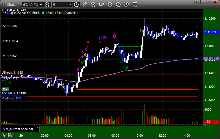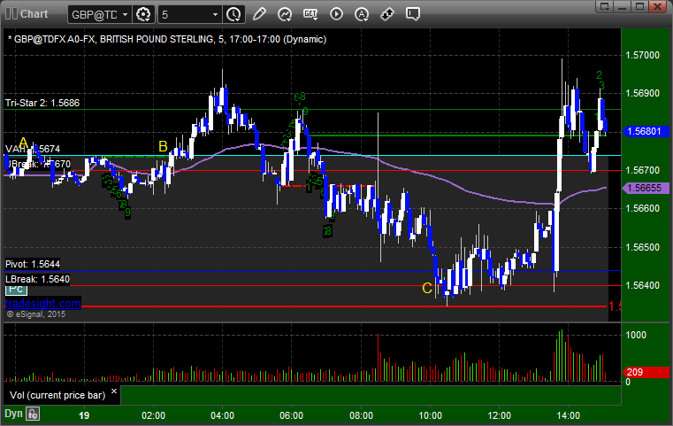 We came into the session long from the prior day. That did not stop. New trade triggered long at A, hit first target at B, and closed the second half of both days' trades at C for end of week: