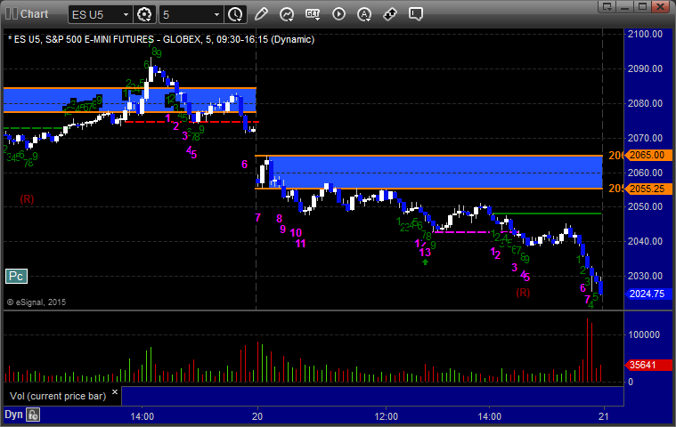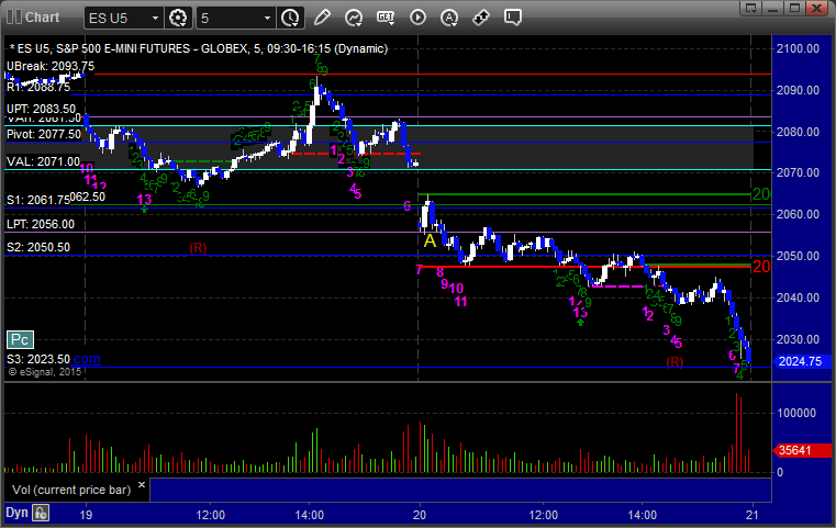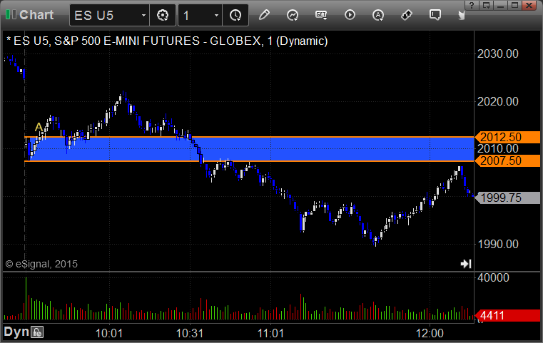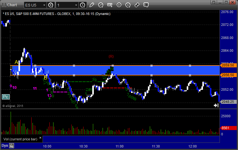 Mark's call triggered short at A at 2055.00, hit first target for 6 ticks, and after lowering the stop several times, we stopped out 18 ticks in the money at 2050.50: