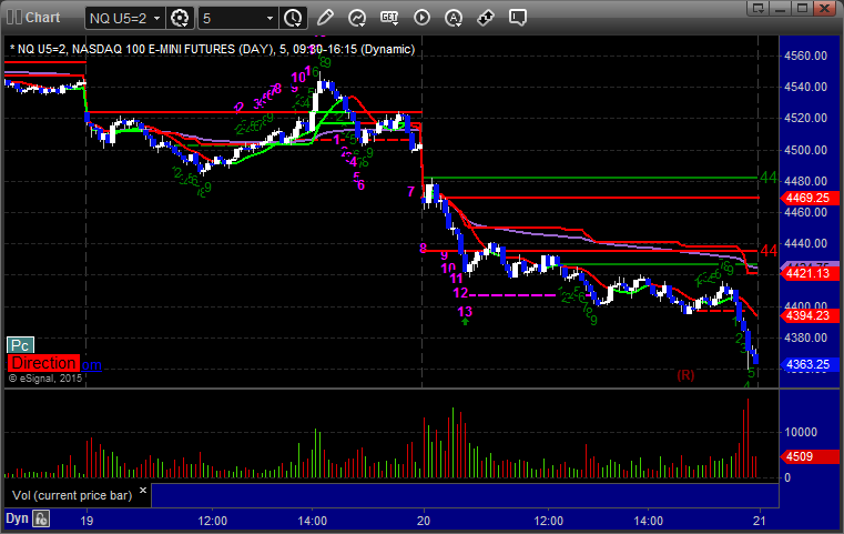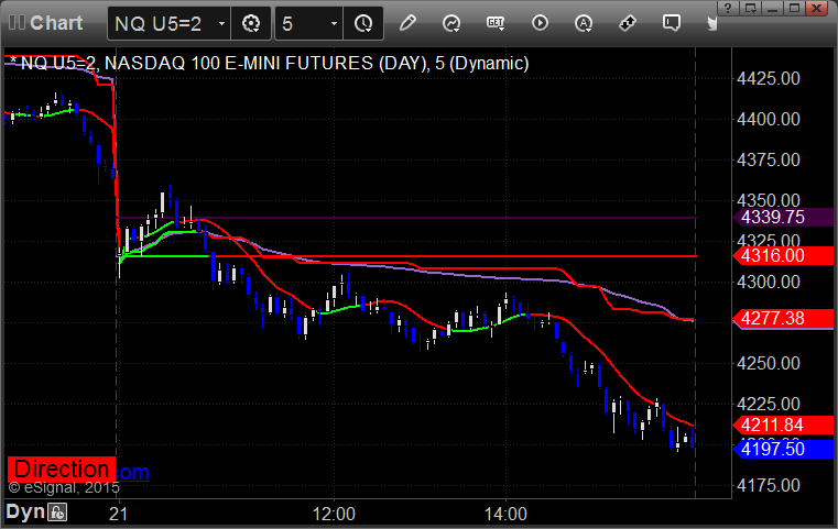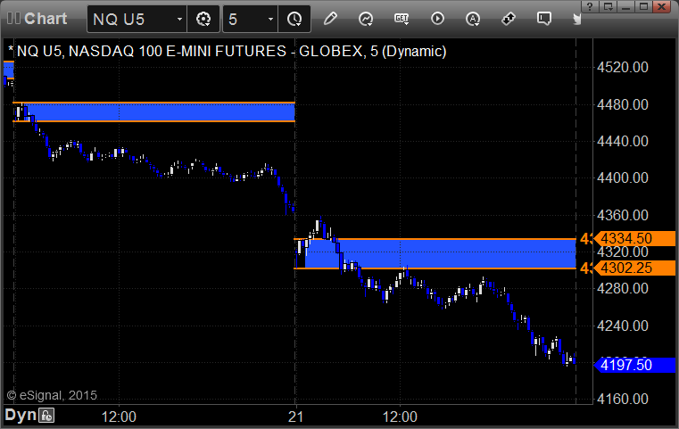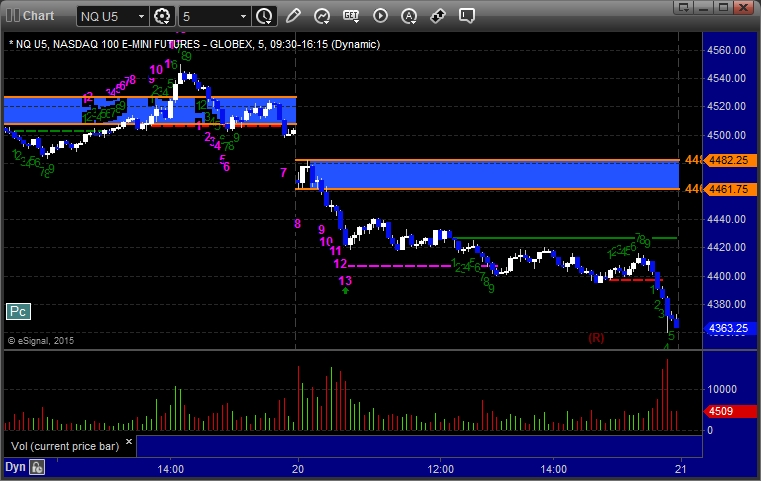 A terrific session for futures. The Opening Range Plays worked in the ES and NQ (both directions each if you wanted), plus Mark had a nice call on the ES that worked. The markets gapped down and did not fill their gaps, heading lower instead on 1.9 billion NASDAQ shares.