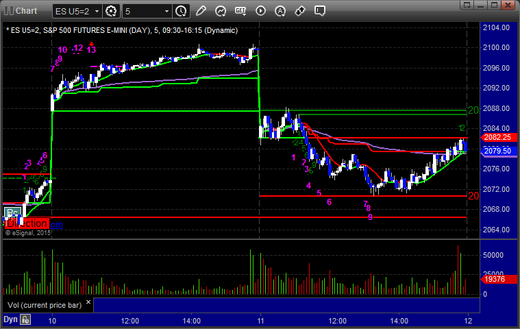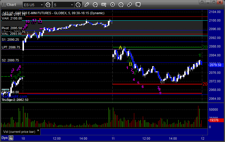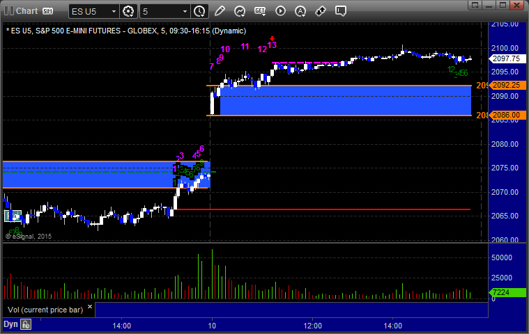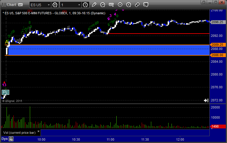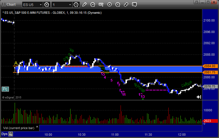 My long call triggered at A at 2087.00 and stopped for 7 ticks. My short triggered at B at 2080.50 and hit a partial for 6 ticks, stopped second half 5 ticks in the money: