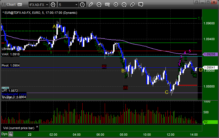 Triggered long at A and stopped. Triggered short at B, never hit first target, found support at LPT at C, and finally closed at entry at D for end of session: